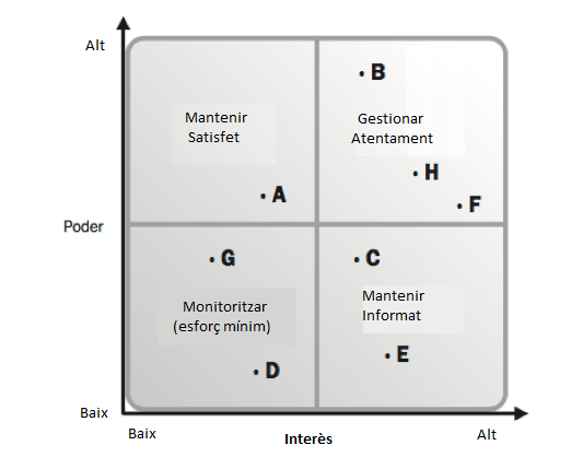 - Classificar-los utilitzant, per exemple, una matriu de poder o interès que agrupa els interessats basant-se en el seu nivell d'autoritat o poder i el seu nivell de preocupació o interès respecte dels resultats del projecte.