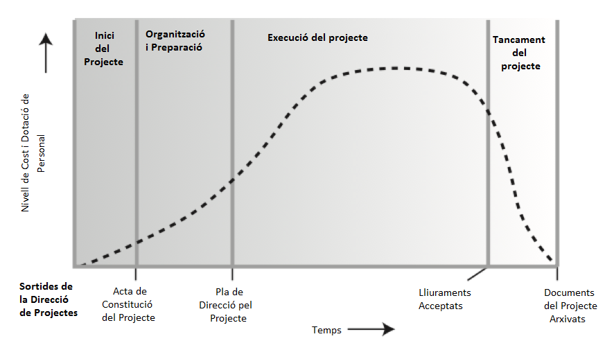 La dedicació del personal i el cost del projecte varia en cada etapa. La distribució típica al llarg de la vida del projecte és la següent: