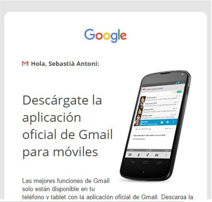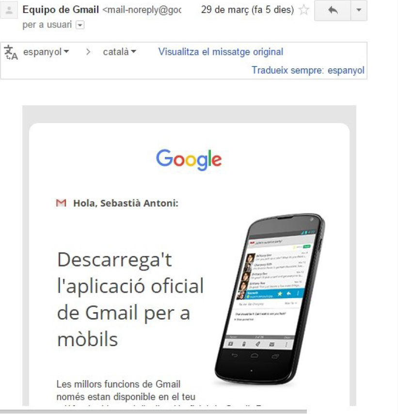 El compte de Google i de Gmail té un idioma configurat. Quan rebem un correu electrònic que no està en l’idioma seleccionat, Gmail ens en deixa fer una traducció automàtica.