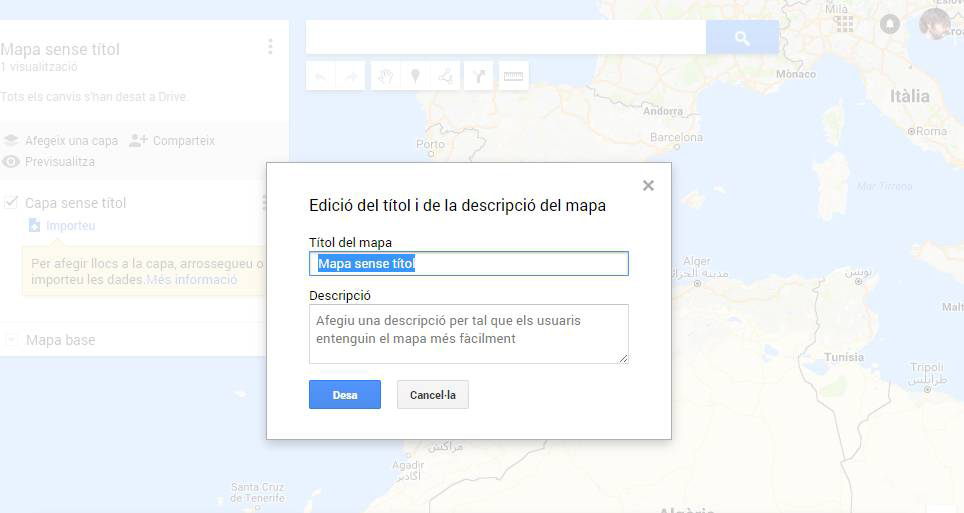 Per assignar-li un títol, cal fer clic al títol actual («Mapa sense títol» és el predefinit) perquè s’obri l’opció de modificar el títol i la descripció del mapa.