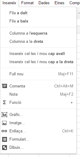 - Fila a dalt: Insereix una fila sobre la cel·la seleccionada.