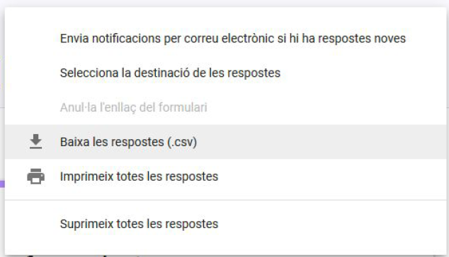 Per descarregar l’arxiu CSV, hem de pitjar el botó «Baixa les respostes (.csv)» que hi ha en el menú d’altres opcions. Un cop fet això, podem importar l’arxiu obtengut amb el nostre programa de fulls de càlcul favorit.