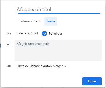 En el camp de text hem d’escriure què volem que se’ns recordi. El camp «Quan» indica quan es farà la tasca. La casella «Tot el dia» indica si la tasca ocupa tot un dia o no. Si la desactivam, haurem d’indicar l’hora de la tasca.