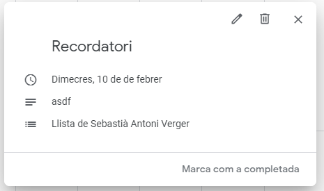 Per desactivar un recordatori, cosa que farem normalment quan hàgim duit a terme la tasca que ens recorda, hi hem de fer clic i a continuació hem de pitjar «Marca com a completat».
