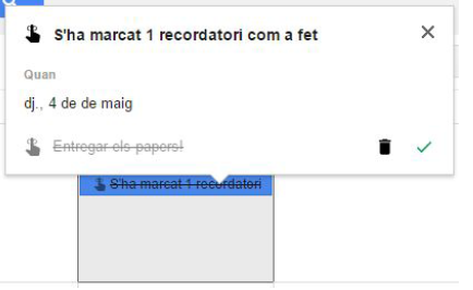 Si feim clic als recordatoris completats, apareix una nova finestra emergent en la qual podem eliminar el recordatori definitivament, o bé marcar-lo com a no completat, pitjant el símbol √ de color verd situat a la part inferior dreta d’aquesta finestra.