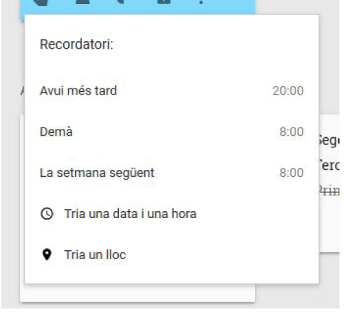 Hi ha dos tipus de recordatoris: temporals i per lloc. Els temporals es programen perquè s’activin passat un cert temps, de manera puntual o periòdica. Els recordatoris per lloc s’activen quan Google detecta que estam situats a prop del lloc indicat en el recordatori.