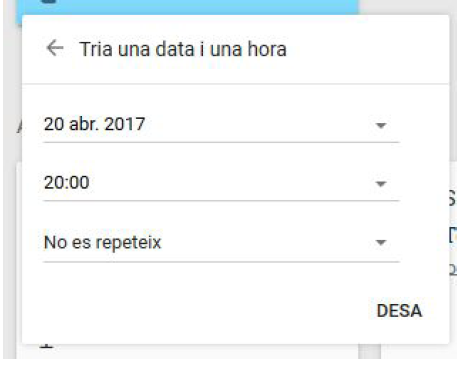En aquest diàleg hi podem seleccionar el dia, l’hora i si s’ha de repetir o no. Per desar els canvis, premem el botó «Desa» que hi ha a la part inferior dreta del diàleg. D’aquesta manera es crearà un nou recordatori.