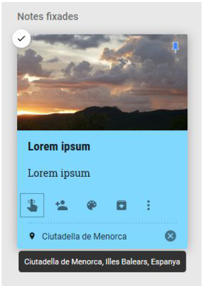 El recordatori configurat amb el lloc es crea i apareix a la part inferior de la nostra nota.