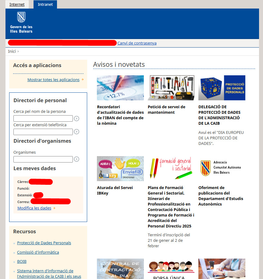 La intranet és el punt d'entrada a l'Administració pel personal de la CAIB. És una plana web des de la qual podem accedir a: