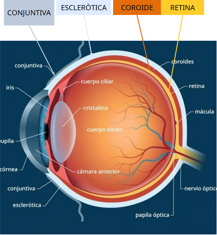 - ESCLERÒTICA: part blanca de l'ull; capa més externa de l’ull espessa i resistent. Està coberta per la conjuntiva, capa transparent.
