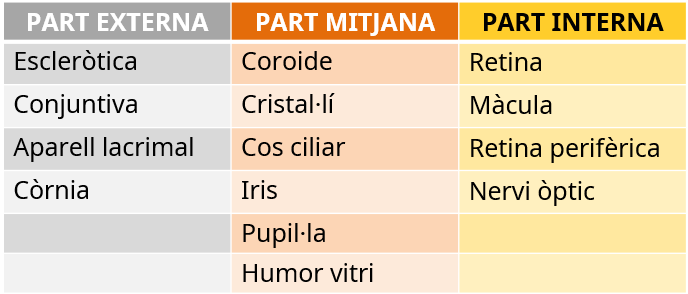 - CÒRNIA: part frontal hemisfèrica i transparent de l'ull que cobreix l'iris. Té una funció protectora i es comporta com una lent que permet el pas de la llum, ajudant a enfocar les imatges sobre la retina. La característica fonamental de la còrnia és la seva transparència, que és deguda a l'absència de vasos sanguinis i limfàtics.