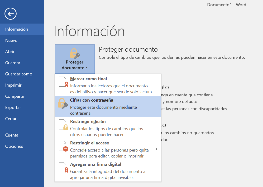 1. Opci贸:聽Fitxer > Informaci贸 > Protegeix el document > Xifra-ho amb contrasenya.