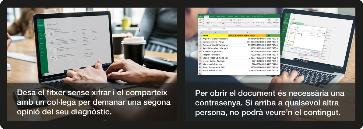 Per enviar documents amb informaci贸 sensible, assegura鈥檛 que estiguin protegits amb contrasenya. Nom茅s el destinatari que tu tri茂s en tindr脿 acc茅s. Envia'ls la contrasenya per un canal diferent (per exemple, un SMS o una trucada)