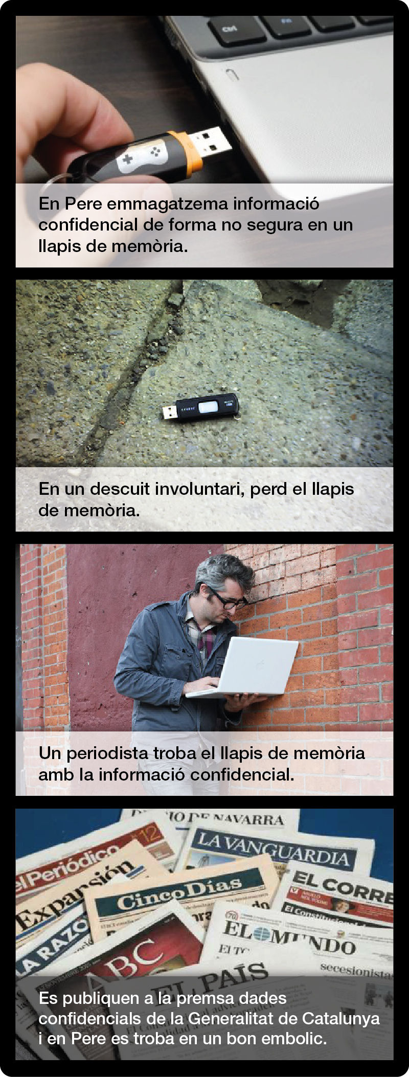 脡s important que no utilitzis聽correus personals聽per transmetre聽informaci贸 confidencial聽i que sempre intentis emmagatzemar-la en alguna ubicaci贸 a la xarxa corporativa (per exemple, servidor de fitxers corporatiu, aplicacions corporatives, etc.), en lloc d鈥檈mmagatzemar-la al teu equip (disc dur de l鈥檕rdinador) o en un suport extra茂ble (DVD, mem貌ria USB, disc dur extern, etc.).